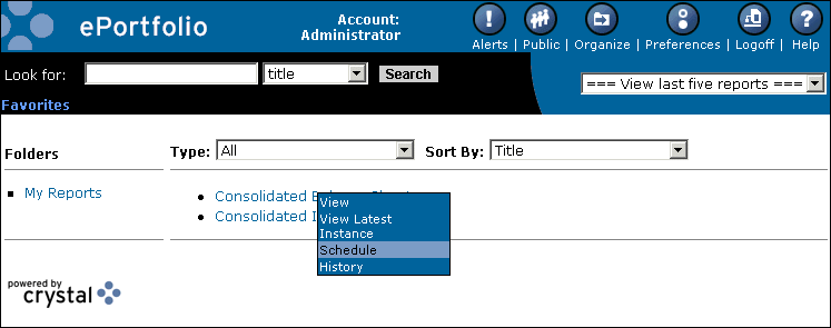 Note: Before scheduling reports, check your time zone setting on the Preferences page in ePortfolio. The default time zone is local to the web server that is running Crystal Enterprise, not to the Automatic Process Scheduler (APS) machine(s) that each user connects to. By setting your time zone, you ensure that your scheduled reports are processed in accordance with the time zone in which you are working. You must have your own account on the system in order to set your preferences.