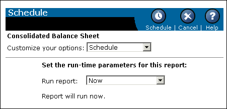 Note: For some scheduling options, the settings that the administrator has specified for the report will be displayed when you choose that option. You can schedule a report with these options or customize your options.